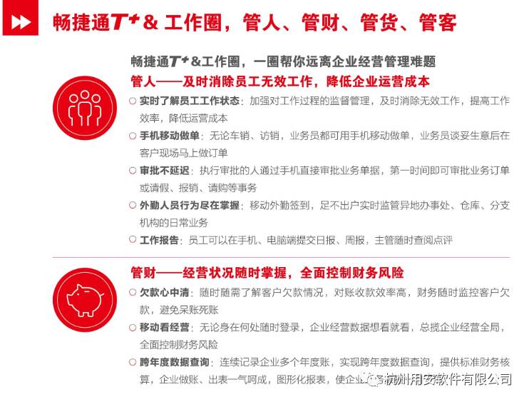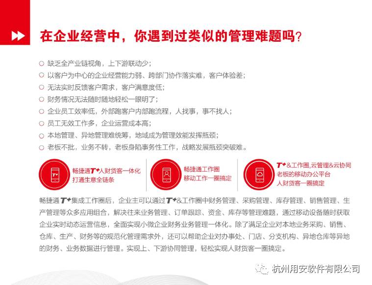 基于此,畅捷通打造了新生意模式下“人、财、货、客”一体化管理的服务理念,即针对企业面临的商品流转加速,供应链管理、库存管理实时精准等的难题,全面整合协同办公、财务管理、进销存管理、客户收支管理等业务,推出T+、工作圈、好会计、好生意等应用及组合应用,为企业提供”人、财、货、客”一体化管理服务。在此理念下,重磅推出T+订货商城。T+订货商城打造的是一个帮助企业构建下级客户(经销商、加盟商)向企业快速、准确订货的自助订货平台,在帮助企业节省接单人工成本、提高配送速度、减少商品断货、提高销量方面价值非凡。最为关键的是,T+订货商城是国内首款将客户订单实时同步至ERP系统的客户自助订货平台,能够帮助企业实现完整的业务及财务流程对接。作为首款由源头订单直通后台业务处理的智能订货平台,T+订货商城可实现前台接单实时同步至企业后台管理系统,业务单、对账单实时呈现、更新,达到业务财务联动,老板随时把控企业销售及运营动态的使用效果。